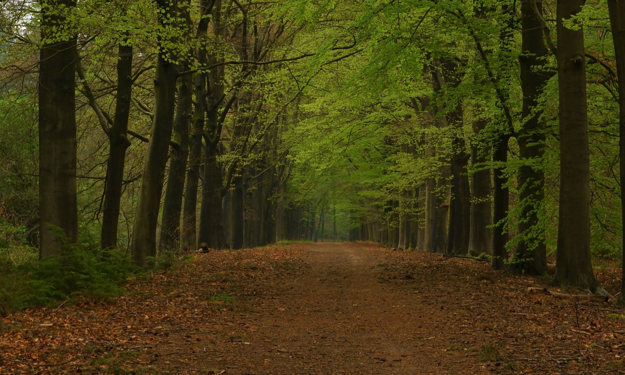 Foto onder : Een laan met bomen met het opkomende jonge groen, de bodem wordt nog gekleurd door de gevallen bladeren die nog niet helemaal weg zijn.