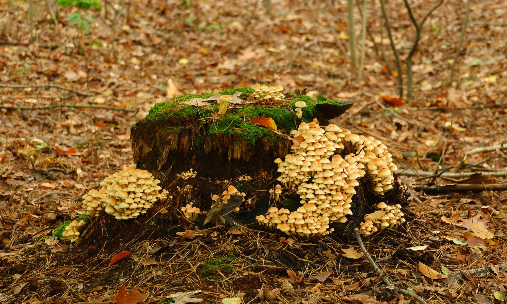 Afgezaagde of omgevallen bomen zijn het decorstuk bij uitstek om groepen paddenstoelen te fotograferen. Met een grote hoeveelheid lijken ze soms te zijn aangestormd om op die ene boom te mogen groeien en te schitteren.